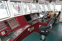 The vessel is the first Rainbow Warrior that is not converted from another vessel. Her hull was constructed in Poland and she was fitted out in Germany. She has state-of-the-art facilities including advanced telecommunication equipment, specialised scientific equipment, and a helicopter landing pad.[6] The ship is also designed to be one of the "greenest" ships afloat, and to showcase this quality, it runs primarily using wind power, with a 55 metre (180') mast system which carries 1255 m² (13,500 sq. ft.) of sail. The ship also has Volvo Penta D65A MT 1850 HP diesel-electric engine and carries up to 110,000 litres (25,000 imp. gal.; 30,000 US gal.) diesel fuel.[7] On board the ship can store up to 59 m³ (77 cu. yd.) of greywater and blackwater, avoiding the need for disposal at sea. All materials, from the paintwork to the insulation, have been chosen with a view to sustainability, and each component has been supplied with transparent ethical sourcing.[2]