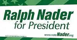 The 2004 presidential campaign of Ralph Nader, political activist, author, lecturer and attorney began on February 23, 2004.[1] This was Nader's third presidential campaign, having run in 1996 and 2000 campaign as the candidate for the Green Party; in 2004 he ran as an independent candidate. Nader won the 2002 endorsement of the Reform Party USA, and thus appeared on the ballot as the Reform Party candidate in several states. In some states, Nader was on the ballot as an independent candidate, while in other states, Nader was deemed not to have met the requirements for ballot access.