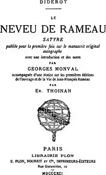 It was first published in 1805 in German translation by Goethe,[1] but the French manuscript used had subsequently disappeared. The German version was translated back into French by de Saur and Saint-Geniès and published in 1821. The first published version based on French manuscript appeared in 1823 in the Brière edition of Diderot's works. Modern editions are based on the complete manuscript in Diderot's own hand found by Georges Monval, the librarian at the Comédie-Française in 1890, while buying music scores from a second-hand bookshop in Paris.[3][4] Monval published his edition of the manuscript in 1891. Subsequently, the manuscript was bought by the Pierpont Morgan Library in New York.