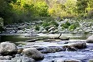 Another Ramganga called Ramganga East originates from the Namik Glacier in Pithoragarh district of Uttarakhand and flows towards South-East.[2][3] The river is fed by numerous small and big rivers and finally joins river Sarju at Rameshwar near Ghat of Pithoragarh.[2] The Sarju in turn converges with the Kali (Sharda).