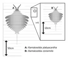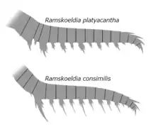 Two species of Ramskoeldia have been described: Ramskoeldia platyacantha and Ramskoeldia consimilis. The endites of R. platyacantha are stout and their length does not exceed the height of the podomere to which they attach. The shaft podomeres 2 and 3 of R. platyacantha also bore prominent endites resembling those of distal articulated podomeres. Conversely, in R. consimilis, the endites of the distal articulated region are slender and most of them have a length that exceeds the height of podomere to which they attach. The shaft of R. consimilis has only a simple endite on podomere 3. The frontal appendages of R. consimilis had been previously misidentified as Anomalocaris saron owing to their similar overall appearance.[1] However, a recent paper has found R. consimilis to be a species within Houcaris instead.[2]