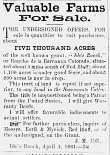 With the cession of California to the United States following the Mexican-American War, the 1848 Treaty of Guadalupe Hidalgo provided that the land grants would be honored. As required by the Land Act of 1851, a claim for Rancho Barranca Colorado was filed with the Public Land Commission in 1852,[4][5] and the grant was patented to William B. Ide in 1860.[6]