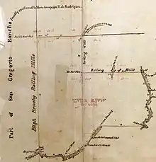 A claim was filed by Salvador Castro for one square league with the Land Commission in 1852 and confirmed in 1856.[8] However, the 1857 official survey of Castro's land gave him more than the Land Commission thought he should to have, the surplus being taken from the lands of the United States. Castro appealed his case to the US Supreme Court, but lost.[9] The San Gregorio (Castro) grant was patented at 4,439 acres (18.0 km2) in 1861.[10]