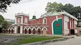 The plan to establish a theatre in Rangpur was first propagated by the RDA in 1885. Later on, in 1891 a piece of land was donated at the heart of the city by the then landlord of Kakina and the official initiatives were taken instantly. In 1896, the piece of land was handed over to the RDA by the Secretary of State for India.[1] The first play organized here was the play "Sharmishtha(1859)"[1] by Michael Madhusudan Dutt. But according to another source,[2] the first play organized here was the "Kulinkulsworboswo"(1854) by Ramnarayan Tarkaratna. This town hall campus also has one of the oldest libraries in the entire Indian subcontinent, the Rangpur Public Library (estb. 1854). This campus also was home to the first ever branch of "Bangiya Sahitya Parishad" outside of Kolkata, the then capital of British India named ''Rangpur Shahitya Parishad''. This campus also has one of the earliest and unique "Shaheed Minars" in Bangladesh commemorating the sacrifices of people martyred during the Language Movement on the streets of Rangpur in 1952. This town hall was used as a "concentration camp" and torture cell for by the Pakistan Army against the resisting Bengali freedom fighters and innocent mass of Rangpur in 1971.[2] Now the whole campus contains two of the Rangpur's premium libraries- the Public Library and the District Library, the Shahid Minar and the regional "Shilpakala Academy" (Arts Academy) of Rangpur. The current building was built in 1913.[2]