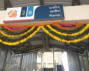 Ranip is an elevated metro station on the North-South Corridor of the Red Line of Ahmedabad Metro in Ahmedabad, India.[1] Around this metro station holds the main DMart SuperMarket along with Ahmedabad Municipal Swimming Complex and Ahmedabad BRTS Workshop and Depot. This phase of the metro system was inaugurated on 30 September 2022 by Prime Minister Narendra Modi and was opened to the public on 6 October 2022.[2][3][4][5]