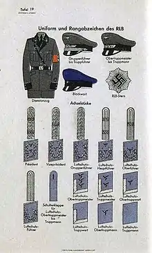 Much like the uniforms of the SA and the SS, the RLB maintained its own elaborate system of uniforms and ranks. While most often a field uniform was worn, that had little accoutrements beyond rank, a shoulder band with RLB insignia, a helmet with RLB identification on it and occasionally a gorget; a service coat did exist, which was modeled off of the standard Nazi Party paramilitary dress.[1] The Nazi armband was worn on the service coat, but was absent on the field uniform, where it was replaced by the RLB armband. A badge that had the initials of the Reichsluftschutzbund on it also existed, and was worn by members both in and out of uniform.