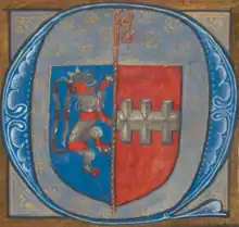 Raphael de Mercatellis began buying books early in life, after having been appointed abbot of St. Peter's abbey in Oudenburg. When he arrived at the wealthy Saint Bavo's Abbey, he used funds from the abbey to commission more and more costly manuscripts.[2] The books commissioned by de Mercatellis were luxuriously made, written on fine parchment and bound in colourful damask, silk or camlet bindings. They often contain his coat of arms and an unidentified monogram, LYS or SLY.[1][4][6] All the manuscripts in his library were commissioned by him, not bought second-hand or ready-made, which is very unusual for a medieval collection.[1] They were made in workshops in Bruges and Ghent. It is possible that de Mercatellis wrote the text of some of the books himself, acting as his own scribe.[7] Commissioning handwritten and decorated books in this way was already becoming old-fashioned during this time, as printed books had started to replace hand-written manuscripts.[8] In fact, miniatures found in several books ordered by de Mercatellis were copies of woodcut prints.[9] Ordering handmade books in this way could have been a way for him to appear distinguished and learned, and could also have been a way to showcase his wealth.[4]