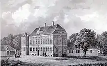 The garden is located to the southeast of the main building and slopes down towards a small lake. To the northwest of the main building is a courtyard surrounded by farm buildings.