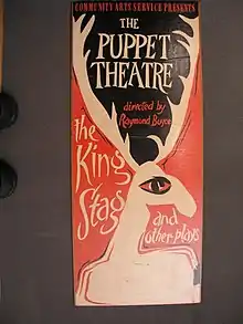 Poster advertising Raymond Boyce, Puppet Theatre. Image of stag in white, red and black. Mounted on wood. Collection of Auckland Museum Tamaki Paenga Hira, 1996.137.59