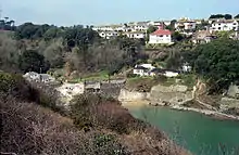 Readymoney Cove (Cornish: Porth Mundy, meaning mineral house cove) is a sandy beach to the south of the harbour town of Fowey, Cornwall, England, United Kingdom. It is sheltered by cliffs close to the mouth of the River Fowey estuary and bounded, on one side, by the medieval part of the town of Fowey and, on the other, by St Catherine's Castle.[1] The beach can be covered during spring tides. The beach is cleaned daily during high season, and a bathing platform is moored in the bay. There is a small shop with public toilet facilities both of which are open all year round. Dogs are banned between 10am and 6pm during July and August. Above the cove is the former coach house which was the home of author, Daphne du Maurier, for a few years during the Second World War. Comedian Dawn French used to live in a house overlooking the cove.