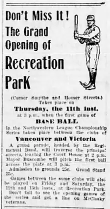 The ballpark was built during a two-month period in the late winter and early spring of 1905. The first game was played on May 11, with Vancouver defeating Victoria 4-2.[Vancouver The Province, May 12, 1905, p.5]