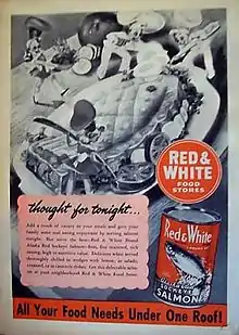 - ↑ Life. October 26, 1953. ISSN 0024-3019. id=p0YEAAAAMBAJ&pg=PA123&dq=%22Red+%26+White%22+%22308+West+Washington%22&hl=en&ei=AbW2TpuXL8XlsQK44qTFAw&sa=X&oi=book_result&ct=result&resnum=1&ved=0CC4Q6AEwAA#v=onepage&q=%22Red%20%26%20White%22%20%22308%20West%20Washington%22&f=false 123 (advertisement). Retrieved from Google Books on November 6, 2011. "RED & WHITE CORPORATION • 308 WEST WASHINGTON STREET CHICAGO 6, ILLINOIS"