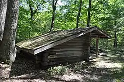 The Red Mountain Shelter is located on the eastern slope of Red Mountain, a 1,652-foot (504 m) hill in the northern part of Mohawk State Forest in eastern Cornwall. It is located along a blue-blazed trail that is a former alignment of the Appalachian Trail, north of Connecticut Route 4. It is a small log structure, with a gabled roof and dry-laid fieldstone foundation. The rectangular structure, open on one side, is built out of saddle-notched logs, with a milled lumber sill at the base of the opening for stability.[2]