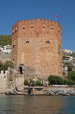 Construction of the building began in the early reign of the Anatolian Seljuq Sultan Ala ad-Din Kay Qubadh I and was completed in 1226. The sultan brought the accomplished architect Ebu Ali Reha from Aleppo, Syria, to Alanya to complete the building.[1] The octagonal red brick tower protects the Tersane (shipyard) which dates from 1221.