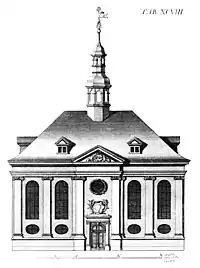 The church is built in red brick and designed in the Dutch Baroque style. It has a rectangular floor plan with a slightly progressing median risalit on the facade toward Gothersgade, decorated with Ionic pilasters and a triangular pediment.[2] Above the entrance there is a cartouche with the monograms of Christian V and Charlotte Amalie and an inscription from Isaiah 2.3.[3]