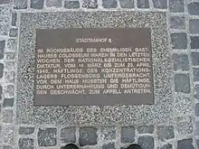 The plaque's text was created under the auspices of the city's cultural department and, after it became known, was heavily criticized in a public debate as trivializing and misleading.[21][22] The inscription was quite controversial, and there were many protests, due to the protesters feeling that the inscribed words played down the historical facts. The politically responsible culture committee of the Regensburg city council then decided in November 2011 that the technically responsible culture department should invite a non-partisan working group. They were supposed to work out a proposal for an appropriate and politically meaningful inscription text or for an urban memorial concept regarding the Nazi era.[23]