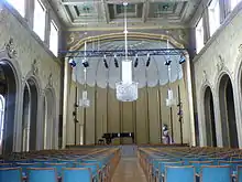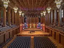 The Max-Littmann-Saal was originally called Großer Saal (Great Hall). After the end of renovation in 2005 it was officially renamed after the architect Max Littmann. The hall of about 455 square meters is 36 meters long, 16 meters high and is surrounded by a large U-shaped gallery. In the case of row seating, the hall accommodates a maximum of 1,160 guests, in the parquet about 660 and on the gallery about 500 seats. It is used for concerts, but also for conferences. Experts count it to the best concert halls of the world.[6] The paneling of cherry-wood gives the hall, which is of the “shoebox type”, a much acclaimed acoustics. Behind the panelling a gap of five to ten centimeters to the wall acts as resonance space. Measurements during the renovation of 2005 brought reverberation times of 1.1 to 1.8 seconds. These acoustics are similar to the Boston Symphony Hall or the Usher Hall in Edinburgh.[7] So the Max-Littmann-Saal often was used for recordings of classical music. In the recent past the Philharmonie Festiva and the conductor Gerd Schaller produced CD recordings of symphonic works of Anton Bruckner,[8] Johannes Brahms, and Franz Schubert,[9] as well as the first recordings of the opera Merlin by Carl Goldmark[10] and the Great Mass by Johann Ritter von Herbeck.[8] Many concerts of the Kissinger Sommer are recorded in the Max-Littmann-Saal by the public broadcasting company Bayerischer Rundfunk. The hall is connected to the neighbouring halls Grüner Saal and Weißer Saal by big foldable doors, which make it possible to enlarge the capacity of the Max-Littmann-Saal.
