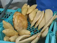 A variety of cakes and fritters collectively known as mofo are available from kiosks in towns and cities across Madagascar.[5] The most common is mofo gasy, "Malagasy bread", made from a batter of sweetened rice flour poured into greased circular molds and cooked over charcoal. Mofo gasy is a breakfast food and is often eaten with coffee, also sold at kiosks.[6] In coastal areas this mofo is made with coconut milk and is known as mokary.[7] Other sweet mofo include a deep-fried doughnut called menakely[8] and a fried dough ball called mofo baolina,[9] as well as a variety of fruit fritters, with pineapple and bananas among the most common fruits used.[10] Savory mofo include ramanonaka, a mofo gasy salted and fried in lard,[11] and a fritter flavored with chopped greens, onions, tomatoes, and chilies called mofo sakay, "spicy bread."[12]
