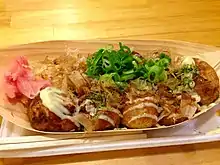 The most popular and well-known street food in Japan is takoyaki, consisting of fried batter filled with octopus, onions, ginger, and tempura pieces. Traditionally, it is cooked in an iron pan with round holes to create the shape of a takoyaki and it comes in a shape of a ball with fish shaving and sauce. This dish originated from Osaka.[31] The custom of street food is not to eat in the streets because of tradition. It is more acceptable to eat sitting under a roof, at home, or designated eating area.[32]