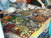 Singapore street food prepares food from various countries due to its diversity and history. The most common dishes includes chicken rice (prepared with chicken broth), chili crab (spicy chili-tomato gravy), laksa (fish soup with vermicelli noodles), char kway teow (stir-fried noodles), chai tow kuay (savory cake), barbecue, and fish ball soup.[27] There are around 78 hawker centers all over Singapore where food vendors surrounds the outside of the market. Each vendors sell their speciality dishes differentiating from each other to provide a variety of experiences.[28]