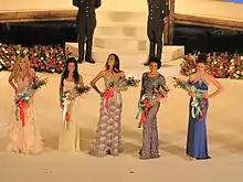 The five finalists at Reinado Internacional del Café 2011: From left to right, Bolivia - María Teresa Roca, Colombia - Jenny Marcela Arias, Venezuela - Angela Ruiz, Dominican Republic - Sofinel Báez, Spain - Ana Isabel Miranda.