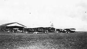 ![]() 94th Aero Squadron - Flightline at Rembercourt Aerodrome, France, late October 1918. Note the wind-direction flag on the headquarters building. It was captured from the German Stenay Airdrome | |