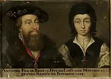Duchess Renée, reportedly, did not have the force of character to exert any political influence in Lorraine.[2] However, she became known for her cultivated Italian taste, and was said to have brought "the graces and refinement of the Mantuan Court" to Lorraine.[3] The blossoming of the arts which took place in Nancy from the reign of Antoine has been attributed to her.[4]
