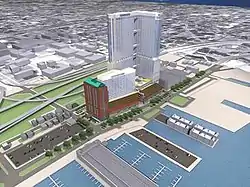 In response to height concerns, the plan was revised in July 2013 to lower the height of the tallest tower to 240 feet and build five towers instead of four.[3]
