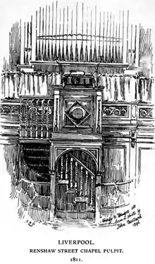 Renshaw Street Unitarian Chapel had its origins in a Presbyterian community at Toxteth Park that was at one time ministered by Richard Mather.[1] That began around 1687 at Castle Hey and moved to Benn's Gardens in 1727.[2] The Benn's Gardens premises became a place of worship for Welsh Wesleyan Methodists[3] when the new Unitarian chapel was built at Renshaw Street in 1811.