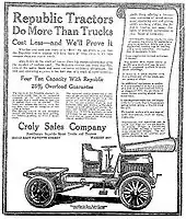 By 1918, Republic was advertising in such national publications as the Saturday Evening Post, declaring that one goes to "Damascus for swords, Teheran [sic] for rugs, Lynn for shoes, Rochester for cameras, Dayton for cash registers, Alma for trucks."[4] Over 3,000 dealers served the United States, with additional dealers in at least 56 foreign countries and colonies.[5]