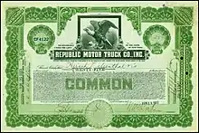 At the end of the war, Republic, which now had an annual capacity of 30,000 trucks a year, decided to expand and financed this expansion by issuing $3 million in gold notes.[2] However, a postwar depression combined with the return of thousands of Liberty trucks to the United States led to a major reduction in demand for new trucks.[2] Republic's output dropped to 1,453 in 1921.[6] Selling Torbensen Axle in 1922 (later Eaton Axle and Spring, now Eaton Corporation) was insufficient to meet cash demands, and Republic was forced into receivership. After reorganization, the company attempted unsuccessfully to regain its former status as a preferred manufacturer, buying the Linn Manufacturing Company, makers of the heavy-duty Linn tractor, in 1927.
