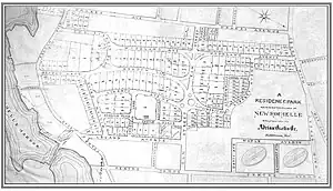 The Garden City Movement arose in England during the 19th century as a reaction to the crowding and pollution of cities as a result of its Industrial Revolution.[3] While the movement had spread to United States by the 1920s, early residential developers had begun experimenting with the 'Garden City' concept way before it gained the title, including Adrian G Iselin, who planned "Residence Park" in 1885. The neighborhood can be viewed as the grandfather to suburban living in the modern American city. Prior to its existence, residential settings were limited to either very rural or very urban design extremes. Lots were fronted by no more than a ditch or a dirt road when not immediately in the urban environment, and when in the city, there was little to no natural space except for public parks.[4] In Residence Park, specific attention to public spaces, natural settings and visual beauty helped distinguish it from most other suburban developments.
