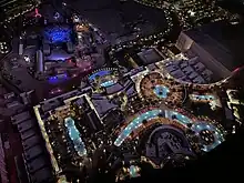 The property includes The District,[110] a 70,000 sq ft (6,500 m2) retail center spread across two floors.[111][112] It has various retailers, including several Fred Segal stores.[113][114] One of the Fred Segal stores is cashier-less and instead utilizes Amazon's "Just Walk Out" technology, automatically detecting items taken from the store and charging customers' credit cards.[115][116] Another store, Kardashian Kloset, sells clothing formerly owned by the Kardashian family.[117] The District also contains several of the resort's restaurants,[110] and The Globe,[110] an LED video globe measuring 50 feet in diameter.[55][118] The Globe stands 40 feet high and has 8,640 triangular LED panels which project interactive images.[110][106] It contains 20 million pixels.[119]