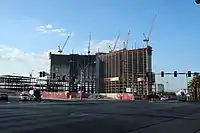 In October 2017, W.A. Richardson Builders was announced as the project's construction manager. That month, demolition began on some steel beams and concrete left from the Echelon project that would not be used in Genting's plans for Resorts World. Cranes were expected to be installed at the site over the following eight weeks, and the resort's opening was expected for late 2020.[42] The hotel towers, adjacent to the eventual casino, were 10 stories tall at the time. Upon completion, the towers were to stand 56 stories and 679 feet, slightly taller than the Wynn Las Vegas resort, located just southeast of Resorts World on the other side of South Las Vegas Boulevard. It was expected that the towers would progress one floor every eight days during construction,[43] which began later in 2017.[44] As of October 2018, the project had reached the 35th floor. More than 1,000 construction workers engaged in steel, concrete, and glasswork throughout the site. Thousands of additional construction workers were expected to be on-site by mid-2019.[45]