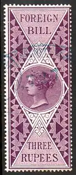 An 1861 3 Rupee Foreign Bill stamp of British India.