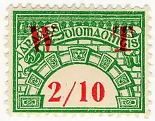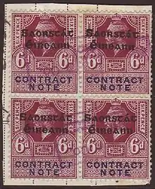 Following partition, the following George V key types were issued for Southern Ireland in 1921–22: Civil Service, Companies Registration, Contract Note, County Courts, Estate Duty, Foreign Bill, Judicature, Land Registry, Official Arbitration and Petty Sessions.[1] At this point, revenue stamps of Northern Ireland were also introduced, and these continued to be issued until the late 20th century.[2]