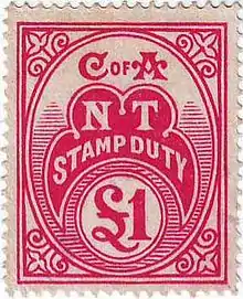 The first issue for stamp duty was issued in 1917.[2] This consisted of six values ranging from 1d to £1, and was used until it was replaced by the North Australia issue in 1929. This consisted of three values of 1d, 6d and 1s. In 1935, revenues of the Northern Territory were reintroduced in the same design as the 1917 issue but with a different watermark. Stamps in this design continued to be used until 1978 with various changes in currency and design. In 1989 a new set depicting wildlife, with values ranging from 50c to $100, was issued, and it remained in use until 2006.