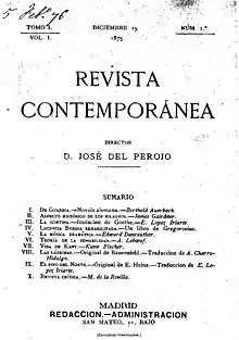 Revista Contemporánea featured literary articles in addition to those about humanistic and scientific fields.[2] In 1879 Perojo sold the publication to José de Cárdenas, and Francisco de Asís Pacheco replaced him as the editor of the magazine.[2] The ideological orientation was liberal until that event, and the magazine became a conservative publication.[1] When it held a liberal view, the magazine frequently featured articles concerning the emancipation of women.[1] From 1901 Juan Ortega y Rubio edited the magazine.[2] The last issue of Revista Contemporánea was published in June 1907 when the owner of the magazine, José de Cárdenas, died.[2]
