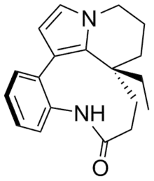 Rhazinilam is an alkaloid first isolated in 1965 by Linde from the Melodinus australis plant. It was later isolated from the shrub Rhazya stricta as well as from other organisms.