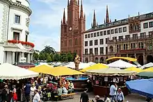 The Rheingauer Weinwoche (literally Rheingau Wine Week) in Wiesbaden, commonly known as Weinfest, takes place annually from the second Friday in August for ten consecutive days on the Palace Square, in front of City Hall.[1] The "longest wine bar in the world" is also measured at the 118 stalls (including 98 wine stands) and Marktkirche stages for music.