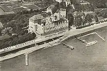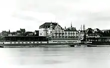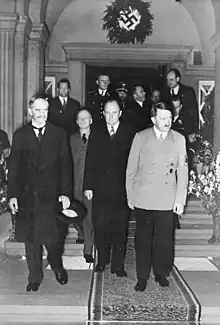 At his first visit to the hotel in 1926 Adolf Hitler checked in as "staatenloser Schriftsteller", meaning "stateless author". He returned there often afterwards. On the night of June 29th-30th, 1934 Hitler met with Joseph Goebbels and Sepp Dietrich in preparation for the Night of the Long Knives.[1] In September 1938 he moved the negotiations with prime minister Chamberlain regarding the Sudetenland[2] crisis to the hotel Dreesen. The hotel owner at the time was considered a "Half-Jew" according to Nazi ideology and had a jewish sister-in-law as well as numerous jewish relatives. Nonetheless, he was able to run his business unperturbed. According to an informant of the American journalist Nora Waln, who stayed in the hotel in the summer of 1934 immediately after Hitler, the owner at the time was "a childhood friend of the Führer".[3] William L. Shirer, an American journalist visiting the hotel in 1938, referred to the owner as "an early Nazi crony of Hitler".[1] In 1934, under the direction of local architect Willy Maß, the 2000 m² terrace ("Kastaniengarten") was fitted with an (at that time unique) electricity-powered glass roof. At the beginning of the war in 1939 the Hotel was seized by the German armed forces and served as a headquarters of the army high command under General Fedor von Bock. In February 1943, it became temporary accommodation for South and Central American diplomats under the French Vichy Regime while continuing to operate as a hotel. After the diplomats' leave in 1944/1945 it became primarily meant for French officers. During this time, from April 1944 at the latest, it functioned as a satellite camp of Buchenwald concentration camp under the cover name "Winzerstube" and was under military guard.[4]