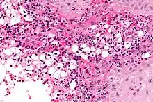 A positive culture in MacConkey agar is diagnostic, but cultures are only positive in 50–60% of cases. Diagnostic characteristics are most commonly found in the granulomatous stage and are described as being plasma cells with birefringent inclusions, Russell bodies, pseudoepitheliomatous hyperplasia, and groups of large vacuolated histiocytes containing Klebsiella rhinoscleromatis (Mikulicz cells).[2]