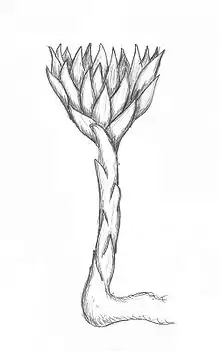 Rhizanthella slateri is a leafless, sympodial herb with a branching, whitish, underground stem up to 150 mm (5.9 in) long and about 15 mm (0.59 in) in diameter with prominent overlapping bracts. The stem is often branched with up to four flowering heads. The heads are up to 20 mm (0.79 in) in diameter and have up to thirty tube-shaped, purplish flowers surrounded by whitish, triangular floral bracts up to 8 mm (0.31 in) long. The dorsal sepal is curved with a thread-like tip and has a broad base that forms a hood over the column and the lateral sepals, sometimes protruding above the floral bracts. The petals are about half as long as the lateral sepals. The labellum is thick, tongue-like, heart-shaped and covered with fine, pimply papillae. The column is short and broad with narrow "wings". Flowering occurs in October and November with the heads maturing below the soil surface or up to 20 mm (0.79 in) above ground level.[2][3][4][5]