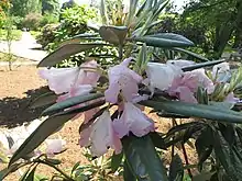 Rhododendron insigne (不凡杜鹃) is a rhododendron species native to southern Sichuan in China, where it grows at altitudes of 700–2,000 m (2,300–6,600 ft). This evergreen shrub grows to 1.5–6 m (4.9–19.7 ft) in height, with leathery leaves that are obovate-elliptic, obovate-lanceolate, oblong, or oblong-lanceolate, 8–13 by 2.5–4.5 cm in size. The flowers are pale to dark pink.