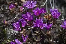 Rhododendron lapponicum, the Lapland rosebay,[1] is a dwarf rhododendron species found in subarctic regions of North America, Europe and Asia, where it grows at altitudes ranging from sea level to 1,900 m (6,200 ft). It is an evergreen prostrate shrub growing to 20–45 cm (7.9–17.7 in) in height, with leaves that are oblong-elliptic or ovate-elliptic to oblong-obovate, 0.4–1.5 by 0.2–0.5 cm in size. The flowers are reddish or purple.