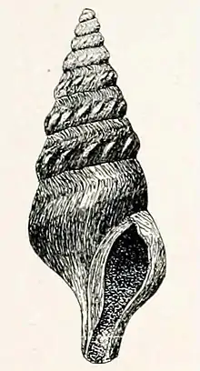 The species is distinguishable by the smooth, ventricose body whorl, sharply angulated whorls, nodose angle, and a long siphonal canal.[2]