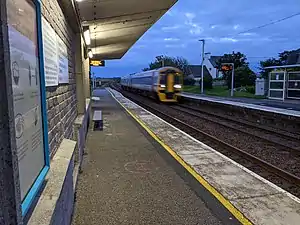 There is a roughly two-hourly weekday service in each direction from the station (with some extra morning and evening trains), plus a limited Sunday service (six to Holyhead, seven toward Chester). Most eastbound trains run to Wrexham General, Shrewsbury and Birmingham International, although a few services run to either Crewe or Cardiff.[4] Trains stop on request.