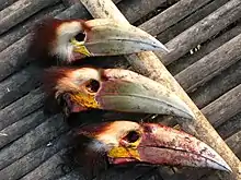 - ↑ Utoyo, L.; Marthy, W.; Noske, R.A. & Surahmat, F. (2017). "Nesting cycle and nest tree characteristics of the Helmeted Hornbill Rhinoplax vigil, compared to the Wreathed Hornbill Rhyticeros undulatus, in Sumatran lowland rainforest". Kukila. 20: 12–22.