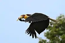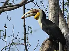 The wreathed hornbill mainly feeds on large fruit with figs making up the majority of its diet.[22] It consumes more drupaceous fruits than other hornbill species.[25][24] It also occasionally eats small animals like insects, crabs, snails and reptiles, particularly during the breeding season.[6] It forages in the forest canopy across its range, sometimes descending to eat small prey or to retrieve fallen fruit.[6] Tropical fruit abundance can greatly vary by location and season, therefore the wreathed hornbill flies long distances to track areas with high fruit availability.[18] As it moves across its range, it disperses the consumed seeds. The seed dispersal behaviour of the wreathed hornbill plays a critical role in maintaining tropical forest diversity.[26]