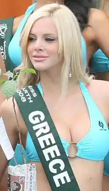 Ria Antoniou (Greek: Ρία Αντωνίου, [ˈria adoˈniu]; born 14 July 1988) is a Greek model and beauty pageant titleholder. In her career she became the winner of Miss Peloponnese 2007[1] and of Star Hellas - Miss Earth Greece 2008,[2] the runner-up in Sexiest Woman Alive 2008,[1] the 2nd runner-up in Miss Model of the World 2007.[1] She was also the "official Greek representative from Star Hellas"[3] in Miss Earth 2008.[3] She is also singer, actress, television personality, internet celebrity and model. She has become a sex symbol of the 2000s and 2010s.
